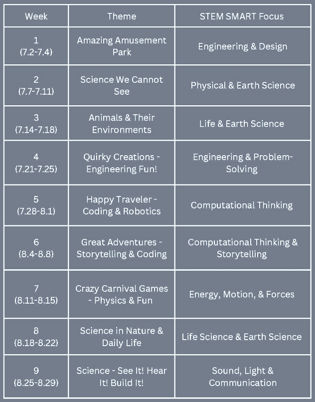 This camp combines robotics with math, physics, and engineering concepts, while incorporating fun science experiments. Kids will learn through hands-on activities, enhancing their logical thinking skills and having an enriching, rewarding summer.